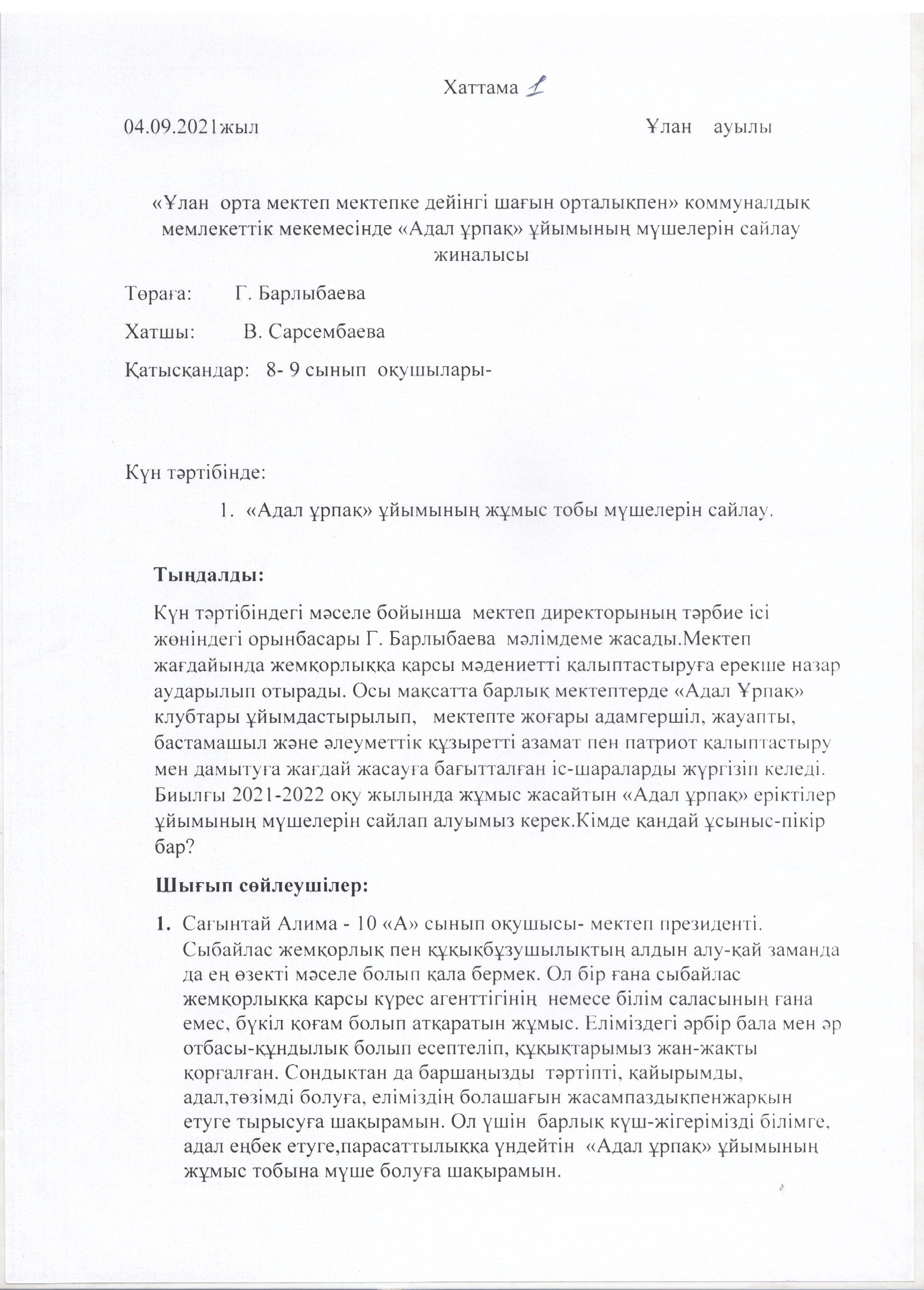 09 сентябрь 2021 "Адал ұрпақ" бұйрық